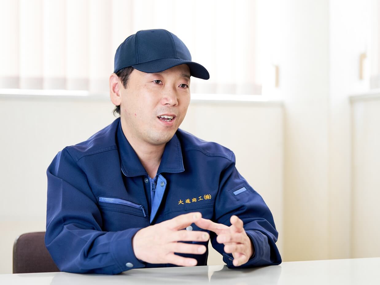 大進商工に入社して改めて思うのは、本当に人間関係が良好な会社だということ。相談などが気軽にできるのはもちろんですが、何か困ったことがあった時も、こちらから相談に行かなくても上司や先輩が声を掛けに来てくれるなど、周りの様子を見ながら気遣ってくれる人たちばかりなんです。こうした環境があるからこそ、今度は後輩たちに「この会社は働きやすいな」と思ってもらえるように、自分自身をもっと成長させていきたいと思いますね。大進商工が守ってきたこの素晴らしい環境を守り、育てられるよう、これからも努力を続けます。