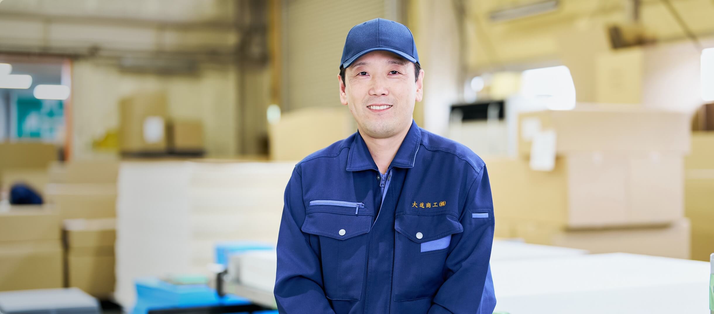 前職では、スリッター機械を使用した機能性フィルムの加工を行っていました。やりがいもあり、満足しながら働いていたのですが、時勢によって勤務していた事業所が閉鎖。別の事業部への異動も考えたのですが、あまりにも遠方だったため都合が付かず、転職をすることにしたんです。前職での経験から、製品加工の仕事を続けたいと思っていたところ、大進商工と出会いました。面接の際、職場見学をさせてもらったのですが、自身の経験を活かせそうな機械も多く、ここでなら頑張れそうと思えたことが決め手となり、入社を決意しました。
