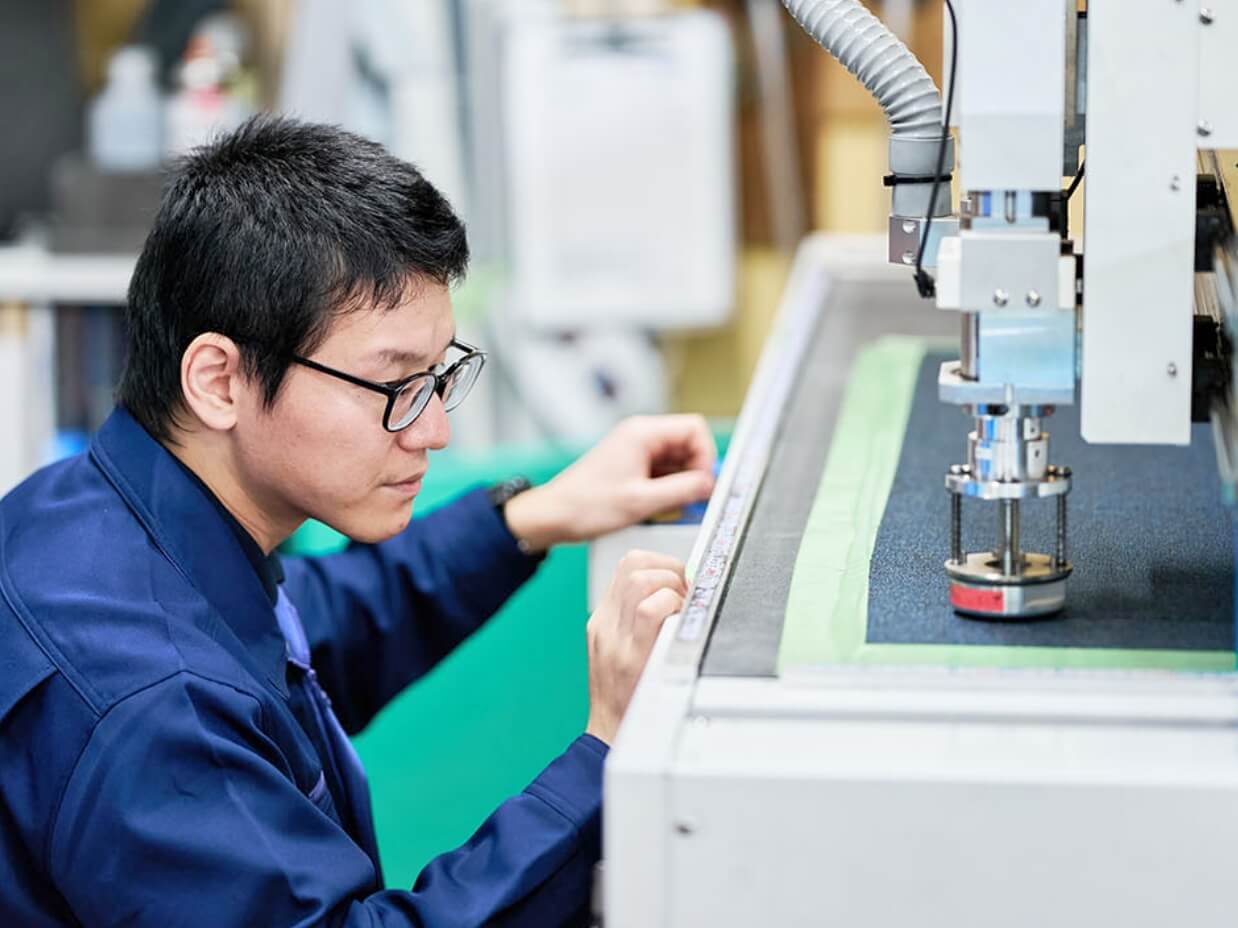 サンプルカッターと呼ばれる、さまざまな素材を指定した形状にカットできる機械を使い、製品加工を行っています。図面に沿って、お客様の希望する形にカットしていくのですが、材料の種類や厚みによって刃の種類を変えたり、機械の各種設定を調整したりする必要があるため、事前にしっかり確認しておくことが大切ですね。慣れないうちはそうした調整がうまくできず、刃を折ってしまったり寸法がずれてしまったりといったこともありましたが、経験を積んでいくことで次第に素材の特徴が掴めるようになり、作業もスムーズに。ミスなく、計画通りに加工が進められた時は、自身の成長も感じられてうれしい気持ちになりますね。